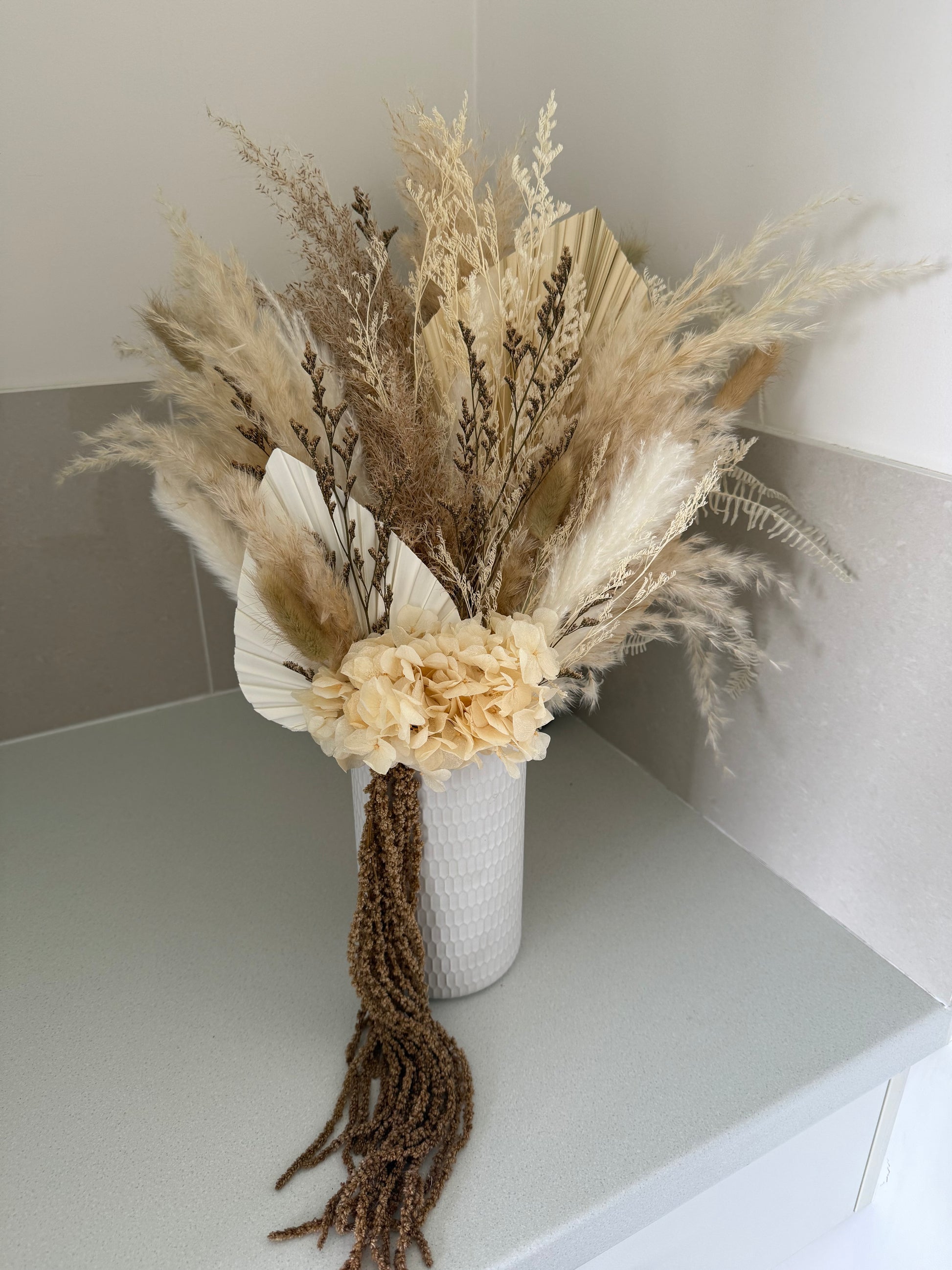 Featuring soft ivory and cream tones layered with subtle hints of warm browns, this piece is thoughtfully arranged to highlight texture, height and natural movement.