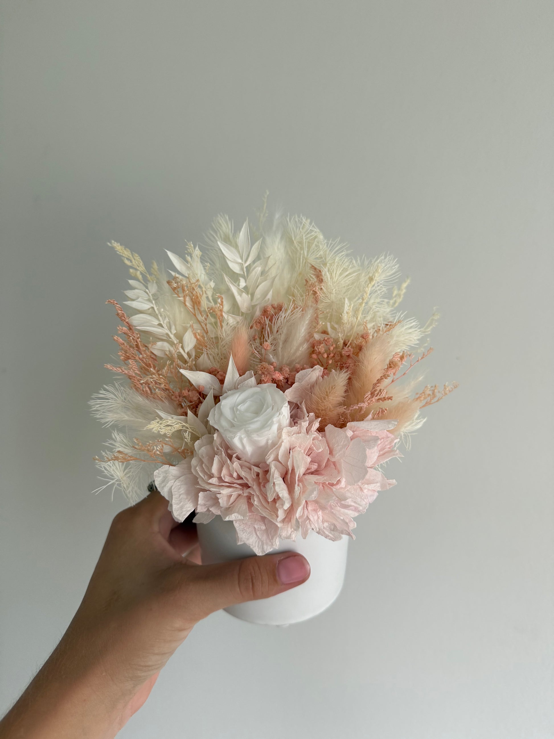 Our Petite Mini Arrangement is a sweet, thoughtfully styled piece designed for smaller spaces and subtle statements. Carefully handcrafted using premium dried and preserved florals, each arrangement is one of a kind — no two are ever the same.